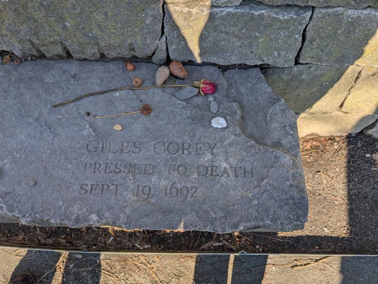When you first approach the memorial it doesn’t seem like it’s going to be anything that spectacular if I’m being honest. Salem was a must when we went to Massachusetts and I thought maybe I built it up too much in my head. But once you get closer the simplicity of the stone work, the names, their date of execution and means effect differently than a grandiose monument might. These were simple people swept up in a tragic social experiment gone horribly wrong. Somehow the monument fits it perfectly. People still leave trinkets on the stones. We saw flowers, rocks, coins, even some toys. These people are not buried here, these are just markers. Giles Corey is believed to have been buried in an unmarked grave in the field by the prison he was held in awaiting questioning.